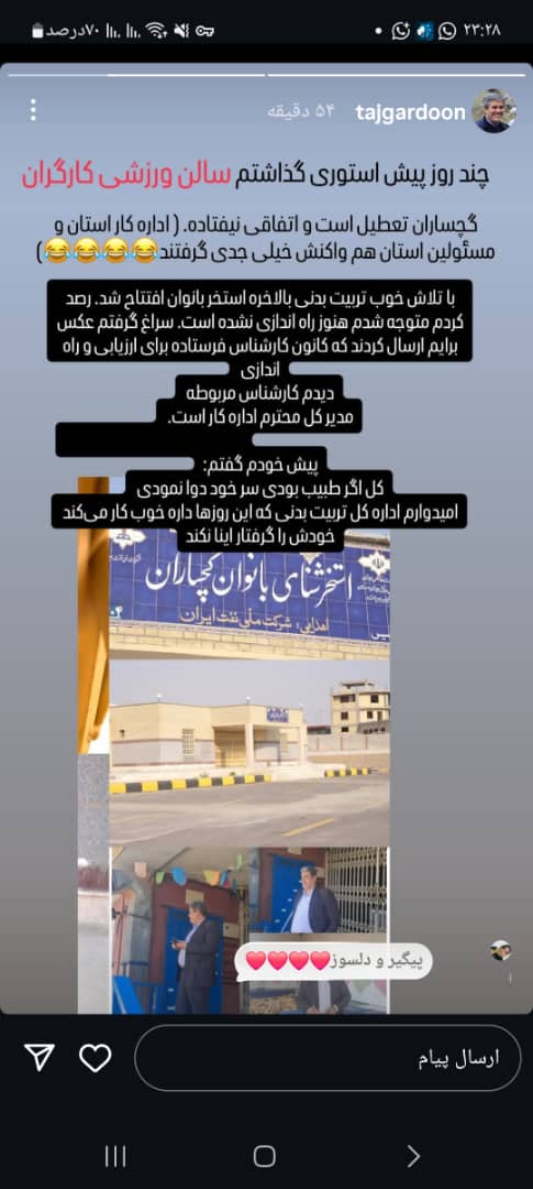 تاجگردون در متن خود با اشاره به پیگیری‌های قبلی نوشت: «چند روز پیش استوری گذاشتم سالن ورزشی کارگران گچساران تعطیل است و اتفاقی نیفتاده. (اداره کار استان و مسئولین استان هم خیلی جدی گرفتند.) با تلاش تربیت بدنی بالاخره استخر بانوان افتتاح شد. رصد کردم متوجه شدم هنوز راه‌اندازی نشده است.»