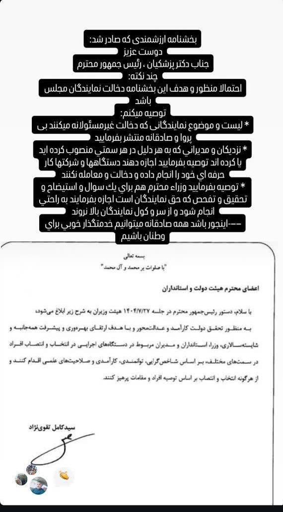 اخیرا بخشنامه ای با امضای سید کامل تقوی نژاد دبیر هیئت دولت منتشر شده که در آن اعلام شده بود در جلسه ۲۷ مهر ۱۴۰۴ هیئت وزیران، رئیس جمهور دستور داده است تا وزرا، استانداران و مدیران دستگاه‌های اجرایی در انتخاب و انتصاب افراد، صرفاً بر اساس شاخص‌های توانمندی، کارآمدی و صلاحیت علمی عمل کنند و از هرگونه انتصاب بر اساس توصیه افراد و مقامات پرهیز شود.